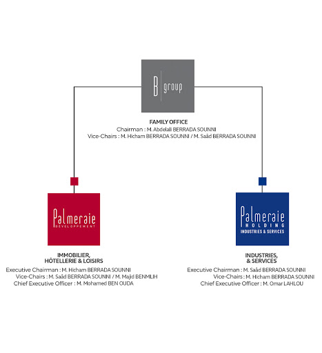 The Group underwent a reorganization for the second time, following a major development of its business segments. Palmeraie Holding gave way to B Group, a Family Office which is better suited to the Group’s ambitions and to the necessity for strategic management. The Group is now structured into 2 divisions - PalmeraieDéveloppementandPalmeraie Industries & Services-. The Group has introduced other sectors of vital importance for the future, namely agriculture, education, mining & quarries.
